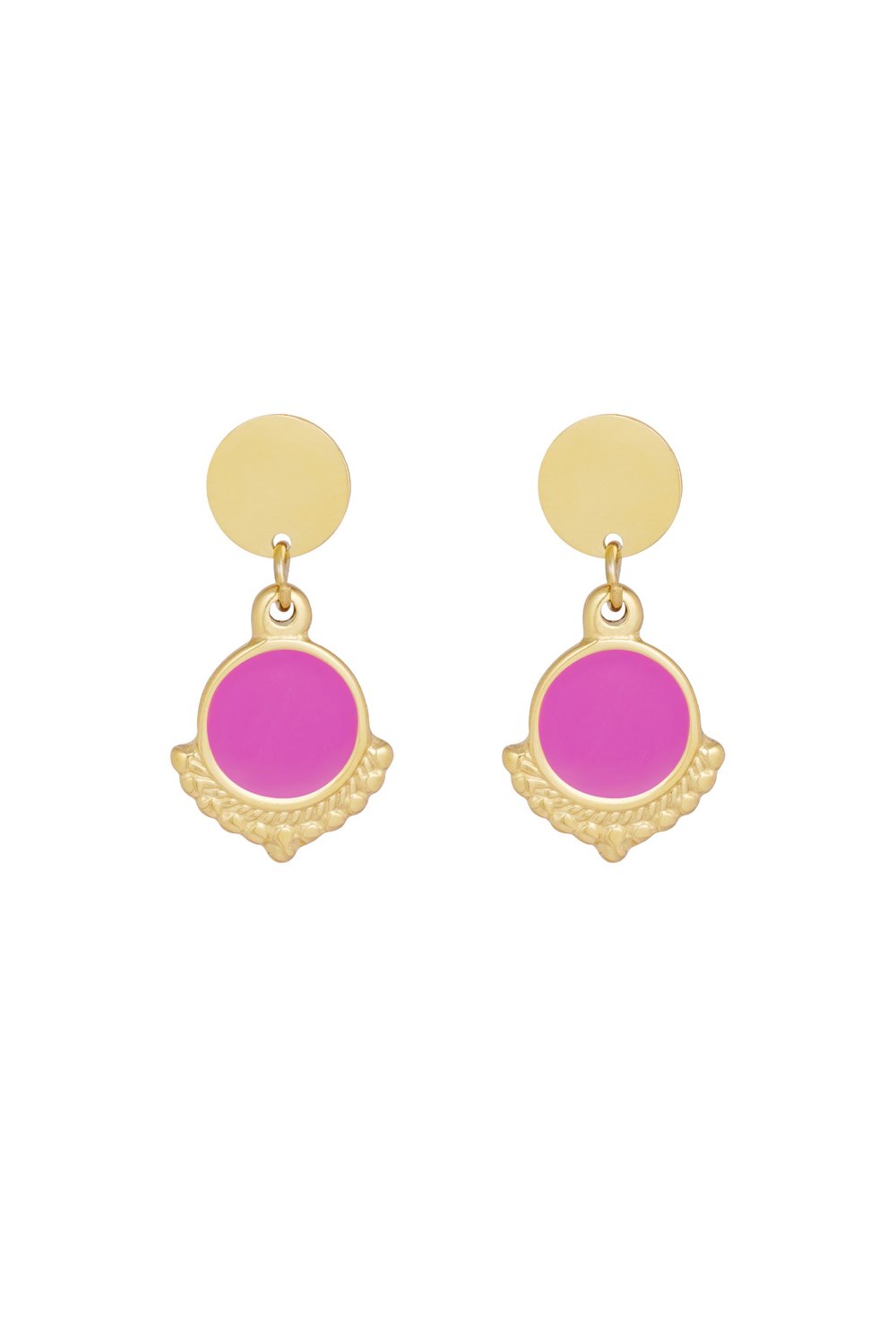 Goudkleurige oorbellen met een sierlijk design en prachtige paarskleurige accenten. Elegant en speels — perfect om je look een opvallende, vrouwelijke touch te geven.